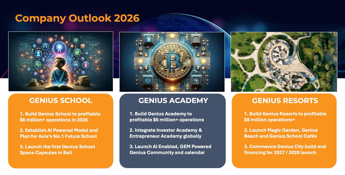 Genius Academy, led by Genius Academy General Manager, Chris Crofts, is also expected to achieve profitable operations with forecasted revenue of over $6 million in 2026. Genius Academy delivers AI Powered, accelerated learning programs for adults in entrepreneurship, investing and the ABCs of the Future (AI, Blockchain, Community). Genius Academy’s 2026 Plan includes: